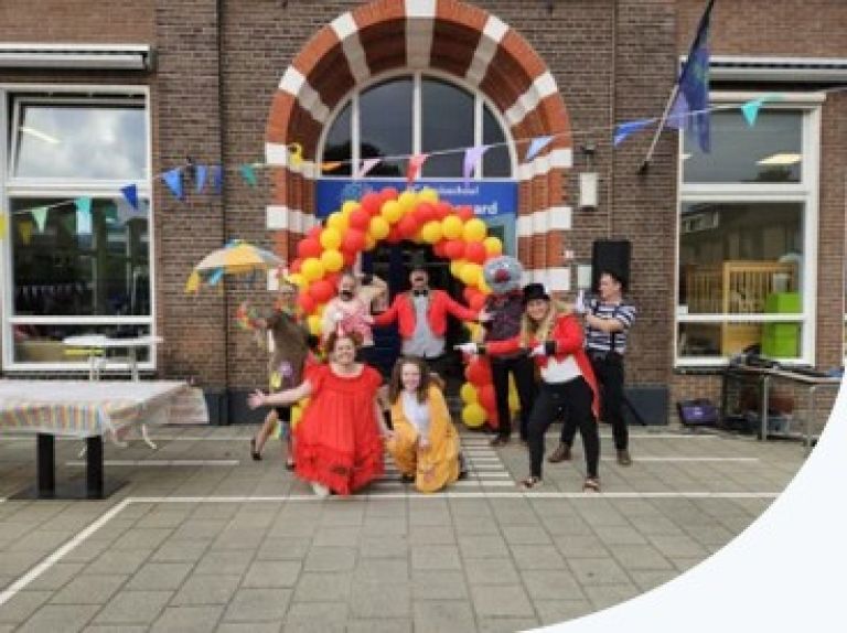 omgetoverd tot een kleurrijk circus vol vrolijke kinderen, leraren en