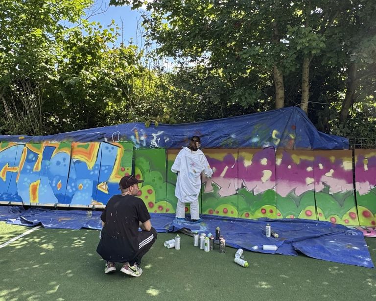 De kinderen kozen uit een berg toffe workshops: rap, graffiti, dans, cartoon tekenen, verf smijten, timmeren, puffy paint, koken, bucketdrummen o.l.v. Movesatschool.